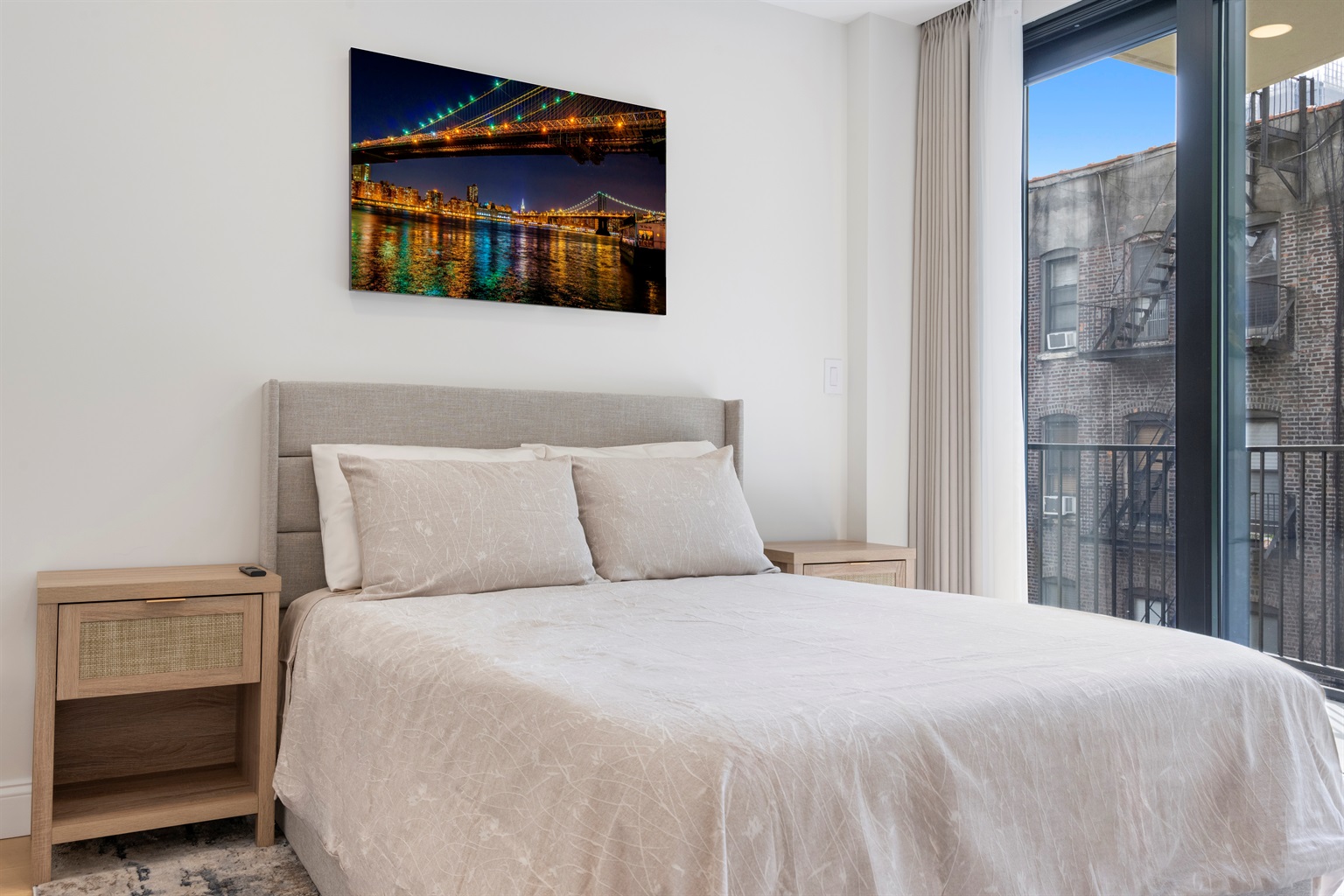 This contemporary home features 4 serene bedrooms (2 on each floor), a bright open-plan living area, a small kitchenette and laundry and a balcony in the rear bedroom with views of the famous NYC skyline (on each floor). Enjoy European-style windows, and curated art that captures Midtown’s creative energy. Central climate control ensures year-round comfort, while the building’s secure keypad and smart-access system offer effortless entry. Thoughtful touches—fine linens, plush towels, artisan toiletries—create a five-star experience in a private residential setting. Each room is appointed with layered window treatments, including a delicate sheer for privacy and premium blackout curtains for complete light control and restful sleep.